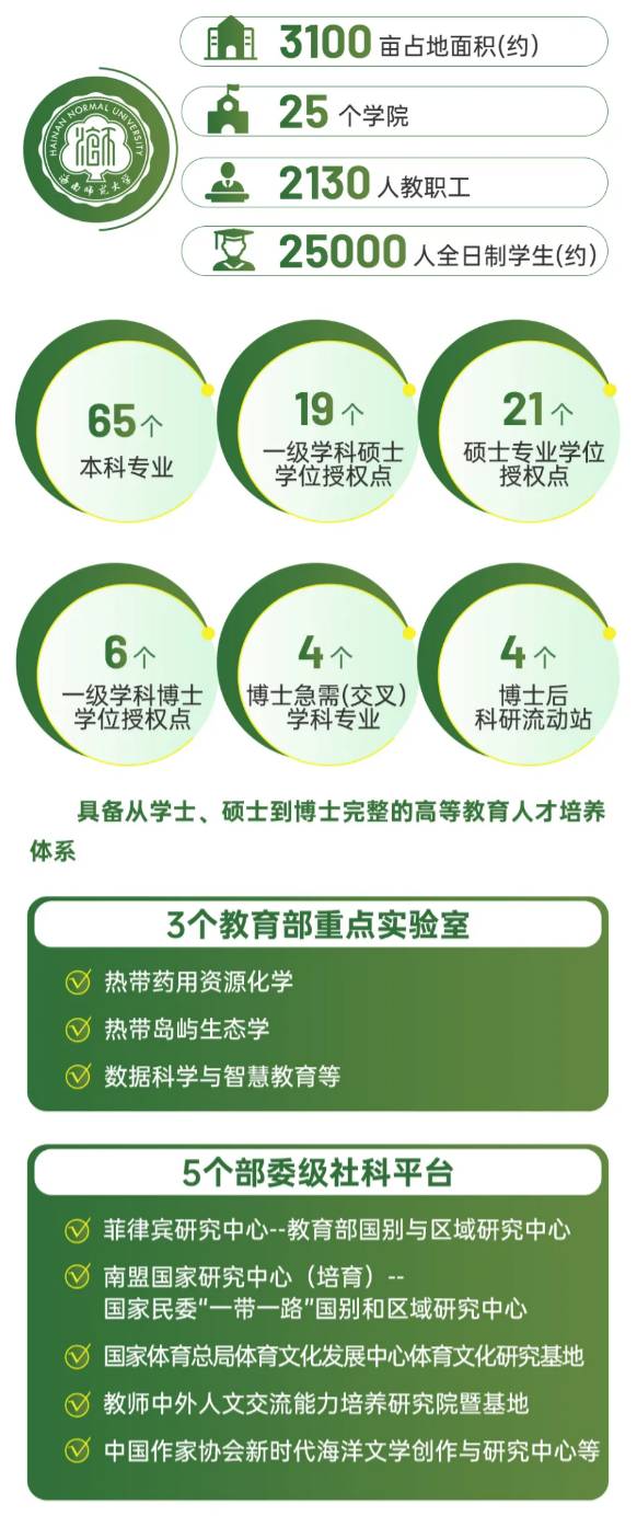 成立于1949年秋的海南師范大學是海南省成立最早的公辦本科高校,是海南省人民政府與教育部共建高校,海南省重點大學,海南省卓越師資、高級專門人才重要培養(yǎng)基地和科學研究基地。學?,F(xiàn)有龍昆南、桂林洋兩個校區(qū):