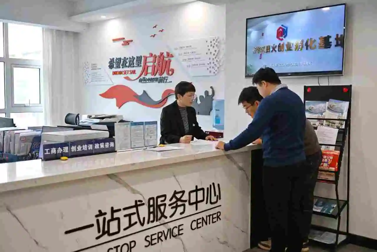 石家莊市新華區(qū)奧火創(chuàng)業(yè)孵化基地工作人員在為創(chuàng)業(yè)者辦理業(yè)務(wù) 牟宇 攝